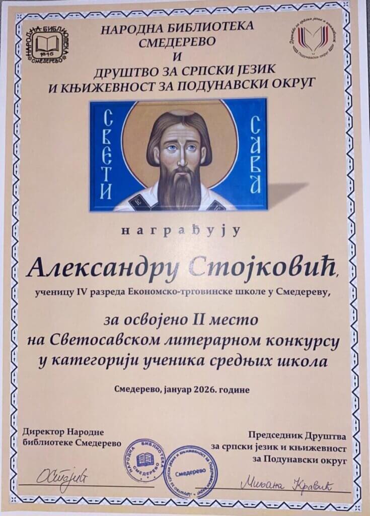 На 12. Светосавском литерарном конкурсу, који организује Друштво за српски језик и књижевност за Подунавски округ и Народна библиотека Смедерево, нашу школу достојно је представљала Александра Стојковић, ученица четвртог разреда, под менторством професорке Невене Миленковић, а њено литерарно остварење награђено је другом наградом у категорији ученика средњих школа.