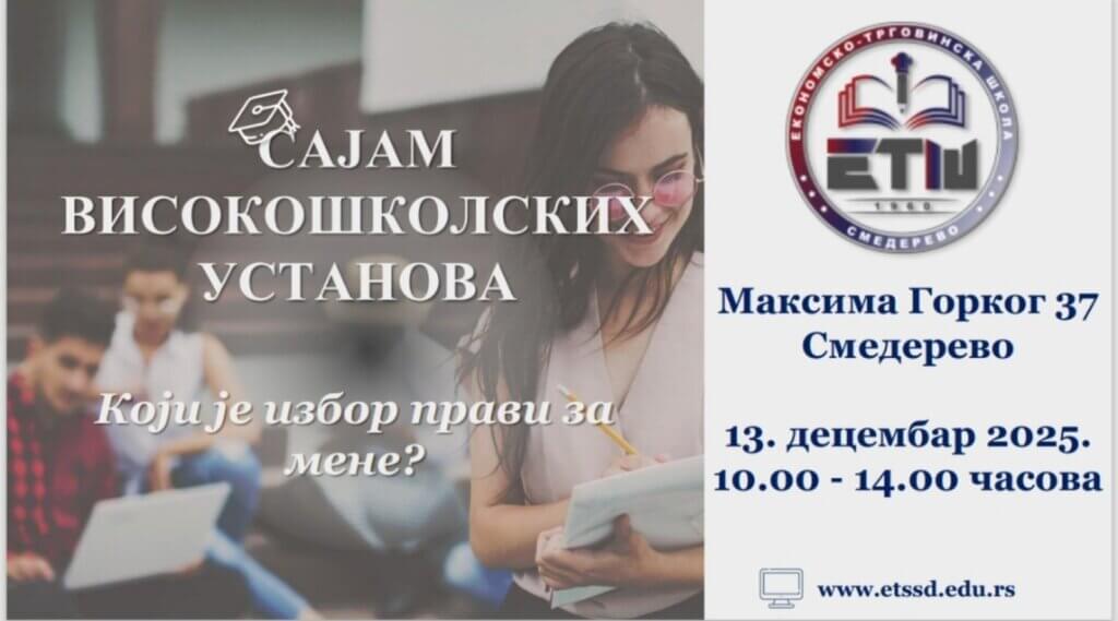 У нашој школи 13.12. 2025. биће одржан, већ традиционални, сајам високошколских установа у трајању од 10 до 14 сати.